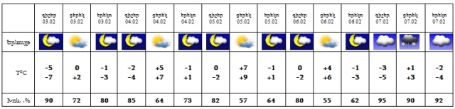 Փետրվարի 3-6-ին սպասվում է առանց տեղումների եղանակ: 7-ին հնարավոր է թույլ ձյուն: