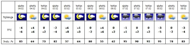 Փետրվարի 6-ին, 9-10-ին սպասվում է առանց տեղումների եղանակ: 7-8-ին սպասվում են տեղումներ: