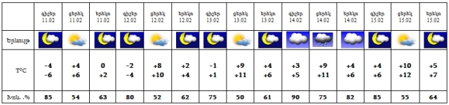 Փետրվարի 11-13-ին, 15-ին սպասվում է առանց տեղումների եղանակ, 14-ին սպասվում է ամպամածության ավելացում, հնարավոր է թույլ անձրև: