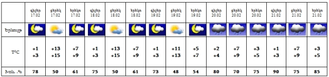 ԵրևանումՓետրվարի 17-19-ը սպասվում է առանց տեղումների եղանակ, 20-21-ին սպասվում է անձրև: