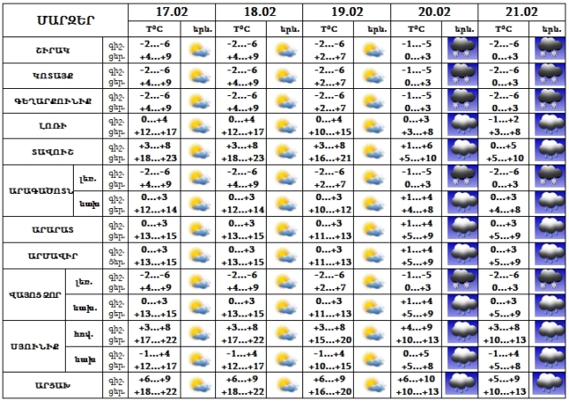 Փետրվարի 17-19-ը սպասվում է առանց տեղումների եղանակ, 20-21-ը շրջանների մեծ մասում սպասվում են տեղումներ: