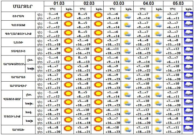 Մարտի 1-4-ը սպասվում է առանց տեղումների եղանակ, 5-ին առանձին շրջաններում սպասվում է անձրև: Քամին՝ արևմտյան` 2-7 մ/վրկ արագությամբ: