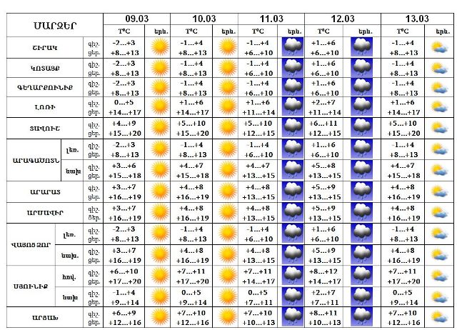 Մարտի 9-10-ին, 11-ի գիշերը, 13-ին սպասվում է առավելապես առանց տեղումների եղանակ, 11-ի ցերեկը, 12-ին սպասվում է անձրև: