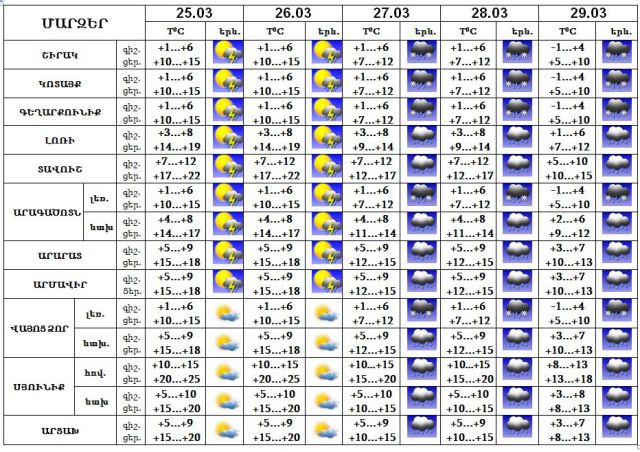 Մարտի 25-26-ը օրվա երկրորդ կեսին հնարավոր է կարճատև անձրև և ամպրոպ, 27-29-ը ժամանակ առ ժամանակ սպասվում է անձրև: 25-ին հնարավոր է քամու ուժգնացում‵ 18-20 մ/վրկ: