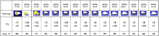 Մարտի 27-ի օրվա երկրորդ կեսին հնարավոր է կարճատև անձրև և ամպրոպ: 28-29-ը ժամանակ առ ժամանակ սպասվում է անձրև: Մարտի 30-ին սպասվում է առանց տեղումների եղանակ, իսկ 31-ին հնարավոր է անձրև: