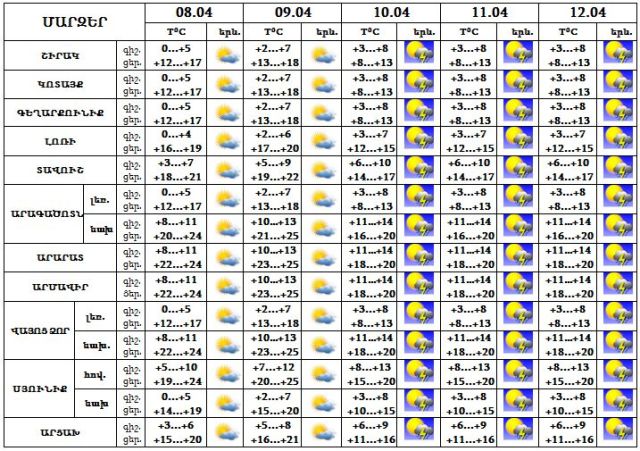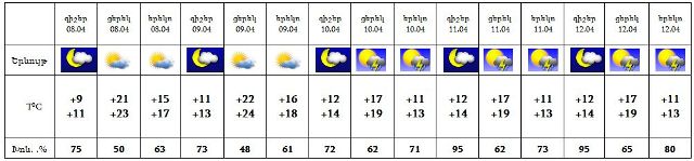 Ապրիլի 8-9-ը սպասվում է առանց տեղումների եղանակ: 10-12-ը` առավելապես օրվա երկրորդ կեսին, շրջանների մեծ մասում սպասվում են կարճատև անձրև և ամպրոպ: Քամին՝ հարավարևմտյան‵ 2-7 մ/վ արագությամբ: Օդի ջերմաստիճանը 10-ի ցերեկը կնվազի 4-5 աստիճանով: