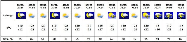 Ապրիլի 27-28-ը երեկոյան ժամերին հնարավոր է կարճատև անձրև և ամպրոպ, 29-ին ժամանակ առ ժամանակ սպասվում է անձրև, ամպրոպի ժամանակ‵ քամու ուժգնացում‵ 18-20 մ/վրկ: