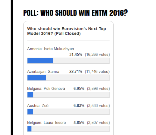 Քվեարկությունն ավարտված է, եւ ինչպես կարելի էր ակնկալել, «Eurovision’s Next Top Model 2016» պատվավոր կոչմանն արժանացել է Իվետա Մուկուչյանը, որը հանդիսատեսին եւ օգտատերերին գրավել է ոչ միայն իր արտաքին տեսքով, այլեւ գեղեցիկ ձայնով։ Իվետան ձայների 31.45%-ովհաղթել է քվեարկությունը՝ առաջ անցնելով Ադրբեջանի եւ Բուլղարիայի ներկայացուցիչներից։