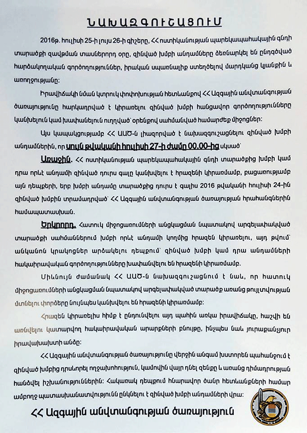 ԱԱԾ-ն զգուշացնում է, որ կեսգիշերից հետո հրազեն կկիրառի