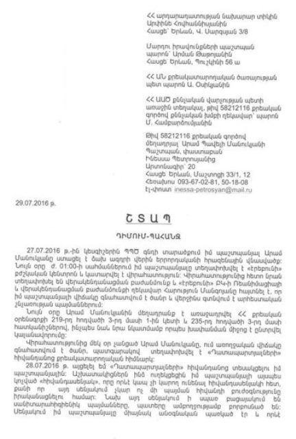 Արամ Մանուկյանի փաստաբան Ինեսսա Պետրոսյանը գրավոր դիմում է ներկայացրել Արդարադատության նախարարին՝ պահանջելով իր պաշտպանյալ Արամ Մանուկյանին «Դատապարտյալների հիվանդանոց» ՔԿՀ-ից տեղափոխել քաղաքացիական հիվանդանոց՝ այդ հաստատության վատթար սանիտարահիգիենիկ պայմանների պատճառով: