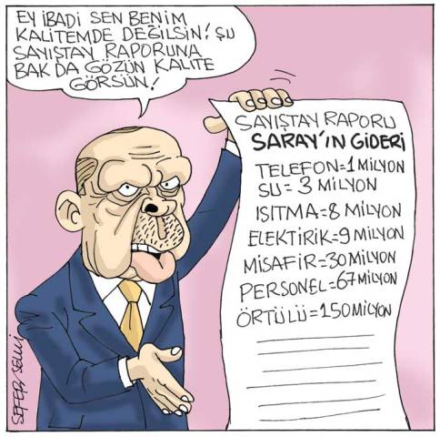 Ծաղրանկարիչը ներկայացրել է նախագահական պալատի ծախսերը. «Հեռախոս՝ 1 միլիոն, ջուր՝ 3 միլիոն, ջեռուցում՝ 8 միլիոն, էլեկտրաէներգիա՝ 9 միլիոն, հյուրերի ընդունելություն՝ 30 միլիոն, անձնակազմ` 67 միլիոն, չհրապարակված ծախսեր՝ 150 միլիոն լիրա»: