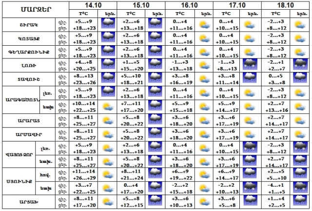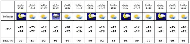 Հոկտեմբերի 14-ին, 16-18-ը սպասվում է առանց տեղումների եղանակ, 15-ին սպասվում է կարճատև անձրև, հնարավոր է ամպրոպ: