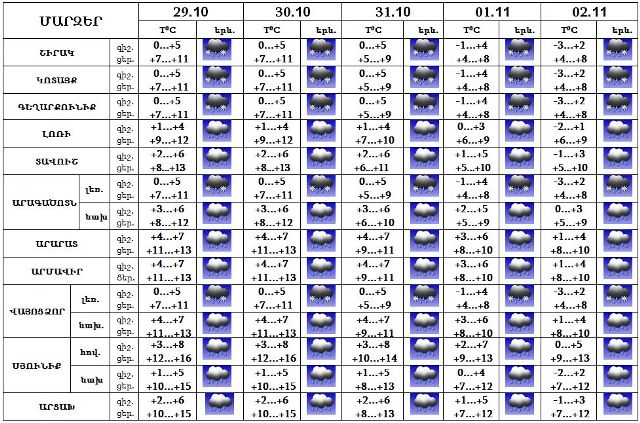 Հոկտեմբերի 29-31-ը, նոյեմբերի 1-2-ը ժամանակ առ ժամանակ սպասվում են տեղումներ, լեռնային գոտիներում՝ թաց ձյուն: