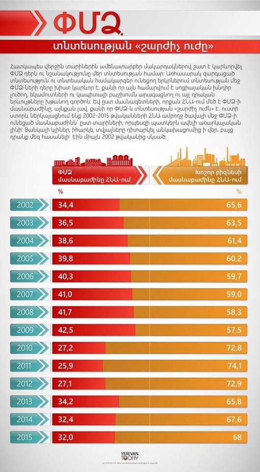 Մինչ 2008 թվականը ՓՄՁ-ի մասնաբաժինը տնտեսության մեջ կայուն աճում էր՝ տնտեսության հետ: Կարող ենք տեսնել նաև, որ համաշխարհային ճգնաժամն էլ այդ ոլորտի վրա մեծ ազդեցություն չէր ունեցել, իսկ 2010-ից ՓՄՁ-ն սկսեց վերանալ: