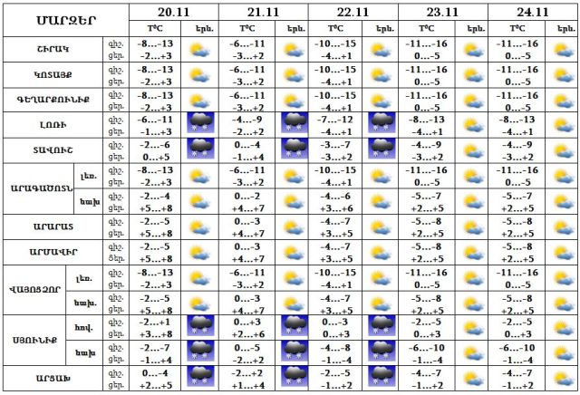Նոյեմբերի 20-22-ին Լոռիում, Տավուշում, Սյունիքում և Արցախում սպասվում է թույլ ձյուն: 23-24-ին սպասվում է առանց տեղումների եղանակ: