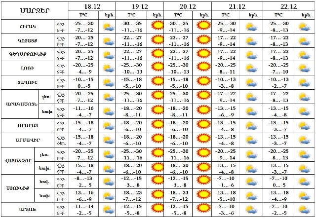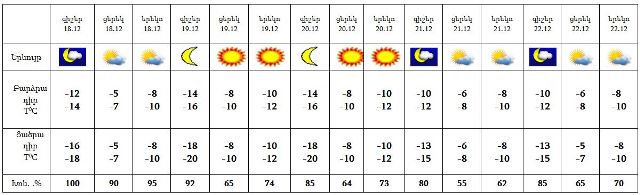 Դեկտեմբերի 18-22-ը սպասվում է առանց տեղումների եղանակ: Քամին՝ հյուսիսարևմտյան՝ 3-8 մ/վրկ արագությամբ: