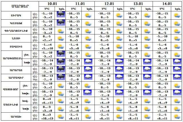 Հունվարի 10-ին Շիրակում, Կոտայքում, Արագածոտնում, Արարատում և Արմավիրում սպասվում է թույլ ձյուն: 11-14-ը սպասվում է առավելապես առանց տեղումների եղանակ:
