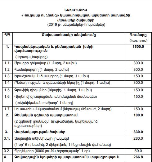 1.5 միլիոն դրամից ծրագրի ղեկավարը (1 մարդ) ստացել է ամսական 300 000 դրամ, ծրագրի համակարգողը ևս այդքան է վարձատրվել: