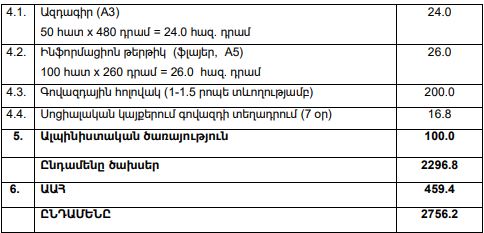 Գովազդային նյութերի պատրաստման և տպագրության համար ծախսվել է 266 800 դրամ, որից 24 000 դրամը` ազդագրի, 26 000 դրամը` ինֆորմացիոն թերթիկի, 200 000 դրամ` գովազդային հոլովակի, 16 800 դրամ` սոցիալական կայքերում գովազդի՝ 7-օրյա տեղադրման համար: