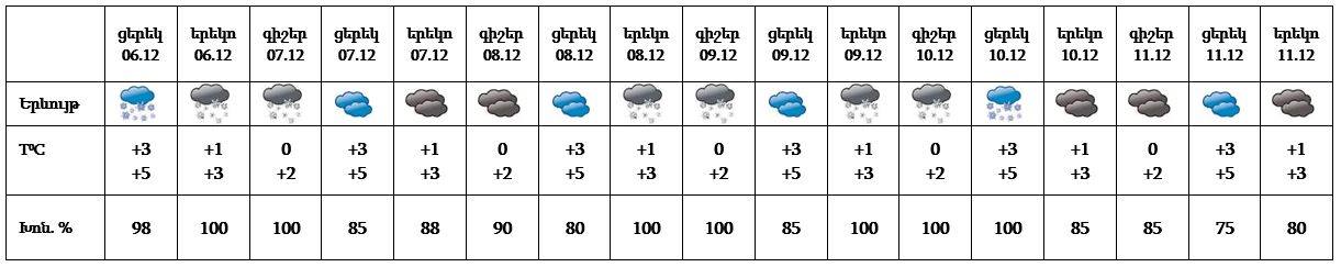 Երևան քաղաքում՝ դեկտեմբերի 6-ի ցերեկը, 7-ին, 8-ի երեկոյան ժամերին, 9-10-ը սպասվում են թույլ տեղումներ՝ թաց ձյան և ձնախառն անձրևի տեսքով, 8-ի գիշերը, 11-ին սպասվում է առանց տեղումների եղանակ։ Գիշերը և առավոտյան ժամերին սպասվում է մառախուղ։