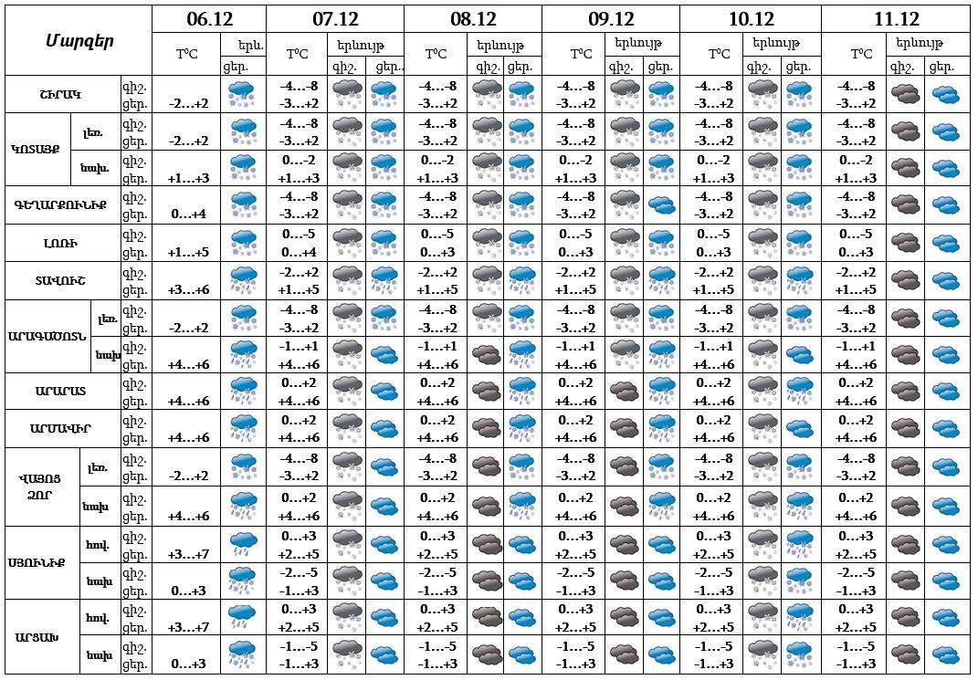 Հանչապետության տարածքում՝ դեկտեմբերի 6-ի ցերեկը, 7-10-ը շրջանների զգալի մասում սպասվում են տեղումներ, լեռնային և նախալեռնային շրջաններում՝ ձյան տեսքով: Դեկտեմբերի 11-ին սպասվում է առանց տեղումների եղանակ: Առանձին վայրերում գիշերը և առավոտյան ժամերին սպասվում է մառախուղ։