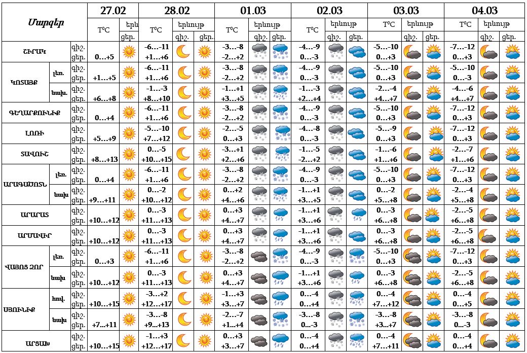 փետրվարի 27-ի ցերեկը, 28-ին, մարտի 2-ին կեսօրից հետո, 3-4-ը սպասվում է առանց տեղումների եղանակ, մարտի 1-ի և 2-ի գիշերը ժամանակ առ ժամանակ սպասվում են տեղումներ։