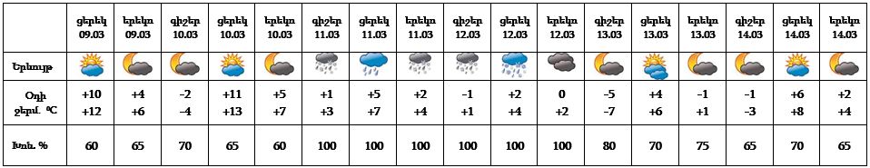 Հանրապետության տարածքում՝ մարտի 9-ի ցերեկը, 10-ին, 13-14-ը սպասվում է առանց տեղումների եղանակ, 11-12-ը հանրապետության ողջ տարածքում սպասվում են տեղումներ՝ լեռնային և նախալեռնային շրջաններում ձյան տեսքով։