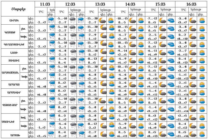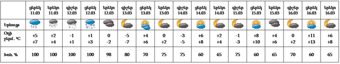 Հանրապետության տարածքում մարտի 11-ի ցերեկը, 12-ին հանրապետության ողջ տարածքում սպասվում են տեղումներ, 11-ի ցերեկը՝ լեռնային և նախալեռնային շրջաններում, 12-ին՝ հանրապետության ողջ տարածքում ձյան տեսքով։ Մարտի 13-16-ին սպասվում է առանց տեղումների եղանակ: