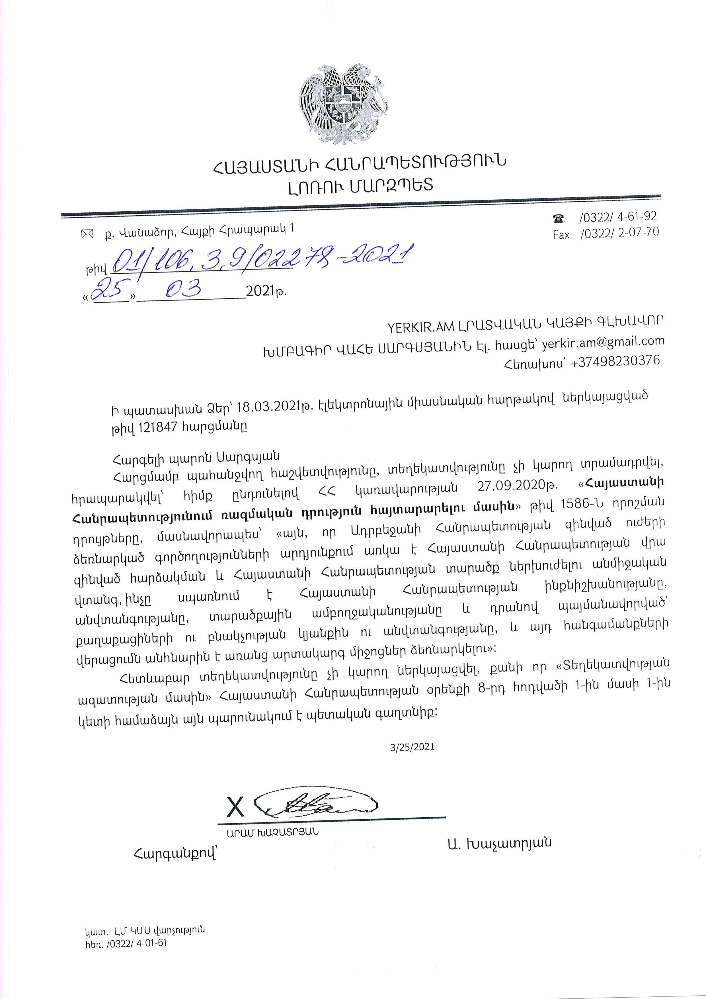Քանի որ Լոռու մարզպետարանից կտրուկ հրաժարվեցին բանավոր բացատրություն տալ, կայքը գրավոր հարցում է ուղարկել Լոռու մարզպետարան՝ պարզաբանում ստանալու՝ մինչ օրս Լոռու մարզպետարանի կողմից ինչո՞ւ չի հրապարակվել պատերազմի օրերին Ռուսաստանից զրահաբաճկոններ և սաղավարտներ գնելու նպատակով Վանաձորի հանրակրթական ուսումնական հաստատություններից ՌԴ ռուբլիով հավաքված գումարի ծախսման մասին հաշվետվությունը, և ե՞րբ է հրապարակվելու այն: Պատասխանն առավել քան ապշեցուցիչ էր՝ տեղեկատվությունը չի կարող ներկայացվել, քանի որ այն պարունակում է պետական գաղտնիք: Փաստորեն, եթե հանկարծ հայ հասարակությունն իմանա, թե ինչ են արել հավաքած փողերը, Ադրբեջանը կարող է նոր պատերազմ սանձազերծել…