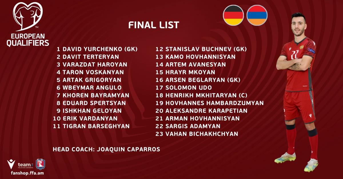 Սեպտեմբերի 5-ին՝ Շտուտգարտի «Մերսեդես-Բենց Արենա» մարզադաշտում, կկայանա ՖԻՖԱ ԱԱ 2022 որակավորման J խմբի հինգերորդ մրցափուլի Գերմանիա-Հայաստան հանդիպումը:Հայաստանի հավաքականի գլխավոր մարզիչ Խոակին Կապառոսն այդ խաղի համար հայտացուցակում ներառել է հետևյալ խաղացողներին.