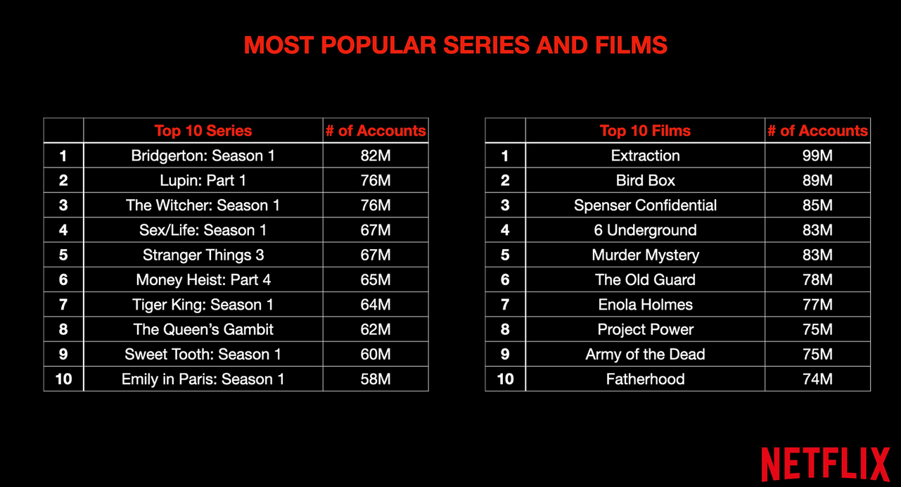 Ըստ ծառայության տվյալների՝ սերիալների ցուցակը գլխավորում է «Բրիջերտոնները» (Bridgerton, 2020) սերիալի առաջին եթերաշրջանը, որը դիտել են 82 գրանցված հանդիսական: Առաջատար եռյակում են ընդգրկվել «Լյուպեն» (Lupin, 2021) և «Կախարդը» (The Witcher, 2020) սերիալները, որոնցից յուրաքանչյուրը դիտել է 76 մլն օգտատեր: