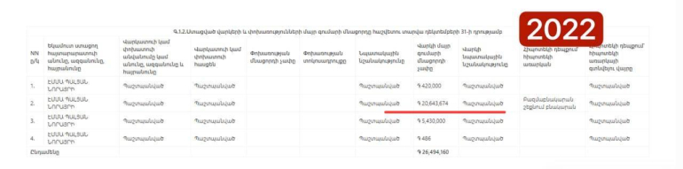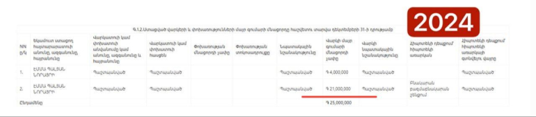 Մարտիրոսյանի ստացած վարկերի եւ փոխառությունների մայր գումարի մնացորդը հաշվետու տարվա դեկտեմբերի 31-ի դրությամբ կազմել է 150 հազար դրամ։