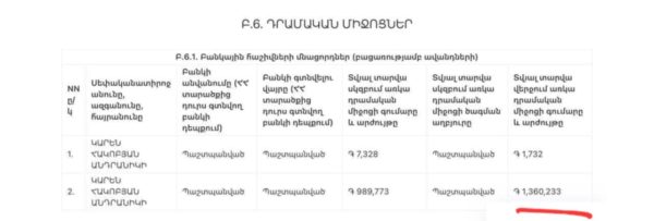 • Ինչպե՞ս է ձևավորվել 12,7 մլն դրամ կանխիկը, եթե տարեկան եկամուտը կազմել է 14 մլն դրամ, և հայտարարագրված չեն այլ աղբյուրներ։