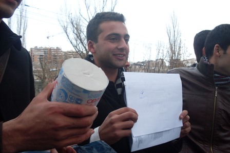 –Մեր ձեռքով նկարած ավանակ ենք բերել, և քանի որ պարոն Բադեյանը չի խոսում, մենք իր համար բերել ենք զուգարանի թուղթ։ Պարոն Բադեյանը չի խոսում, ինքն այլ գործողություն է անում, իսկ այդ այլ գործողությունից հետո պետք է գալիս զուգարանի թուղթ։ Խնդրում ենք, պարո՛ն Բադեյան, ձեր մարմնի այն հատվածը, որը նորմալ մարդկանց մոտ բերան է կոչվում, խոսելուց հետո անպայման սրբել այս թղթով։ 65 մետր է, ինձ թվում է՝ մինչև տարեվերջ իրեն կհերիքի,–ասել է եզդի երիտասարդը,–մենք այս թղթից շատ ունենք։ ՀՀԿ–ից եթե ցանկացողներ լինեն, կարող ենք տրամադրել։