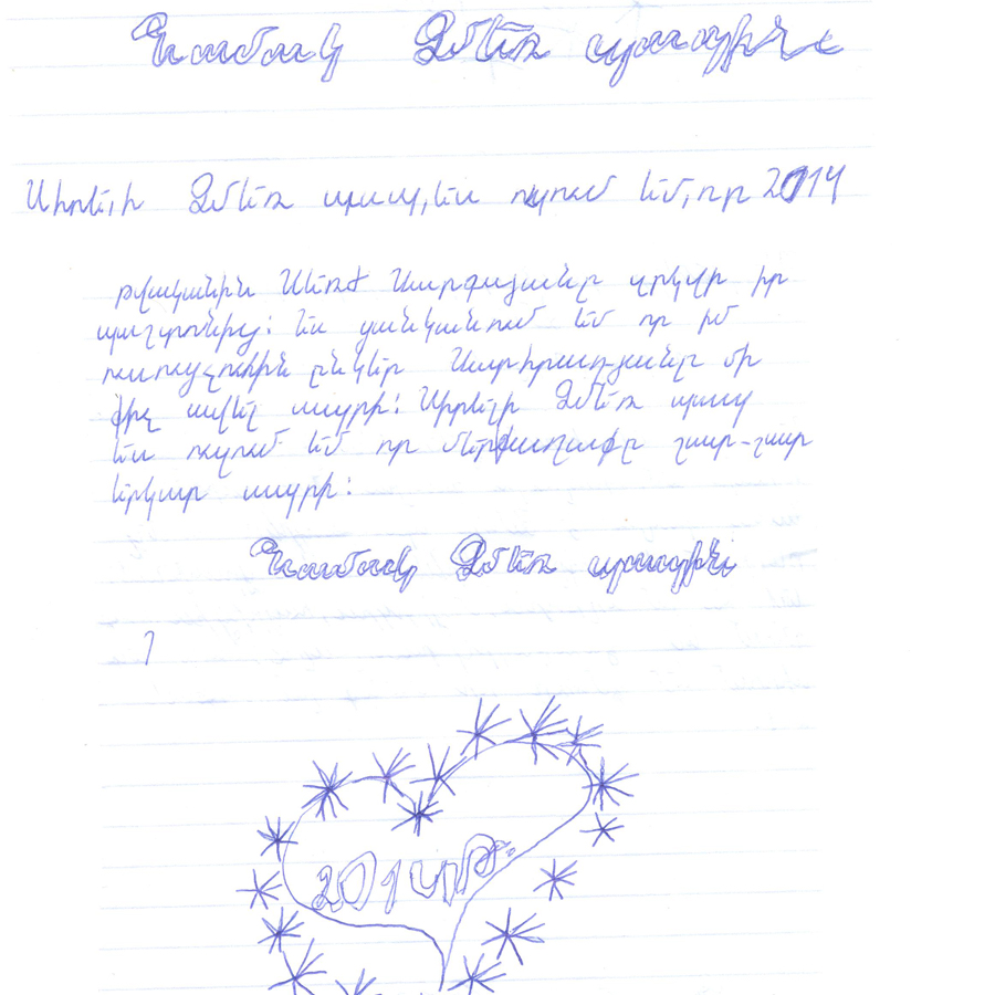 Ուսուցչի հանձնարարականը՝ նամակ գրել Ձմեռ պապիկին եւ շարադրել ամանորյա երազանքները, նա ըմբռնել է յուրովի եւ Ձմեռ պապից խնդրել ոչ թե կոնֆետ, տիկնիկ կամ համակարգիչ, այլ ոչ ավել, ոչ պակաս՝ Սերժ Սարգսյանի պաշտոնանկությունը: