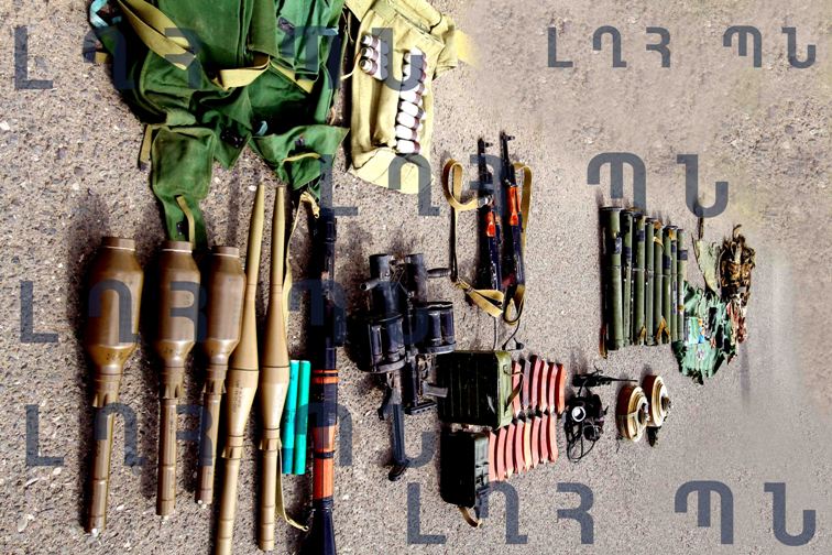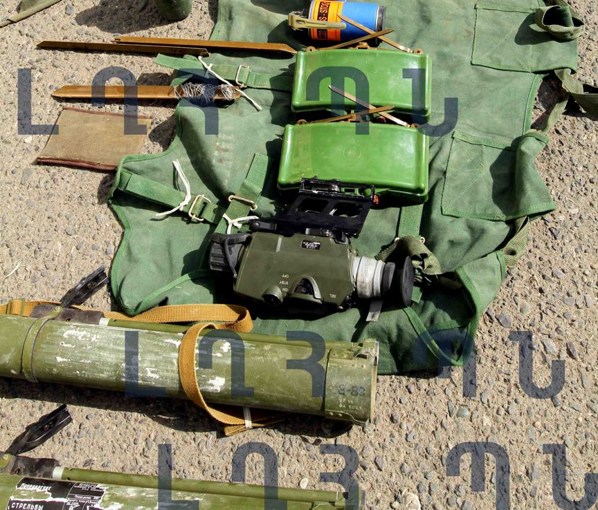 Ադրբեջանական զինուժից առգրավված զինատեսակներն են՝ 1 ձեռքի հակատանկային նռնականետ, 2 ձեռքի նռնականետ /РГ-7 АТР/, 3 թերմոբարիկ նռնակ, 3 պահեստատուփի պայուսակ, 3 վառոդային լիցք, 2 ձեռքի նռնականետ /РГ-6/, 12 հատ БМГ-К տեսակի նռնակ РГ-6 ձեռքի նռնականետի համար, 2 ինքնաձիգ /АКМ, 7.62 мм/, 20 ինքնաձիգի պահունակ, 100 և 200 փամփուշտ տեղավորող գնդացրային 1-ական պահունակ, 2 կապի միջոց /Тадиран ПНР-500/, 2 հակատանկային ական /ТМ-57/, 8 մեկանգամյա նռնականետի կոնտեյներ, 2 հակատանկային ական /МОН-50/, 2 ձայնալուսային նռնակ, 1 տափաշիշ, 1 հարձակողական նռնակ, 4 նռնակ РГД-5 տեսակի, 1 ջերմացուցային նշանոց՝ իսրայելական արտադրության, 1 ձեռնաշղթա, 2 լրակազմի համազգեստ, 1 ոտնակ, 1 հասարակ ջրի շիշ՝ փաթեթավորված մեկուսաժապավենով, 1 դաշտային պայմաններում վիրավոր դուրս հանելու պատգարակ: