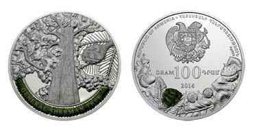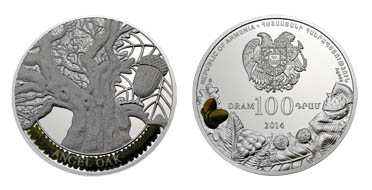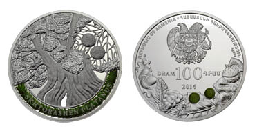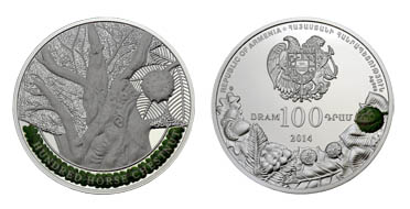 Հուշադրամի դիմերեսին պատկերված է ՀՀ զինանշանը, որից ներքև անվանական արժեքի մակագրությունն է՝ «100 ԴՐԱՄ.DRAM» և թողարկման տարեթիվը` «2014»: Շրջագծով պատկերված են ծառերի պտուղները, դրանցից մեկը` գունազարդված: Ստորին ձախ հատվածում հուշադրամը հատող ընկերության դրոշմակնիքն է, իսկ եզրաշուրթի շրջագծով հայերեն և անգլերեն լեզուներով մակագրված են «ՀԱՅԱՍՏԱՆԻ ՀԱՆՐԱՊԵՏՈՒԹՅՈՒՆ» և «REPUBLIC OF ARMENIA»: