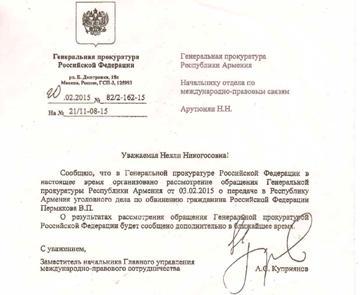 ՀՀ գլխավոր դատախազության միջնորդությունն այժմ քննարկվում է ՌԴ գործընկերների կողմից: Միջնորդության շուրջ ստեղծված թյուրըմբռնումներից խուսափելու համար հրապարակում ենք դրա վերաբերյալ ՀՀ գլխավոր դատախազության միջազգային-իրավական կապերի բաժնի կողմից ՌԴ գլխավոր դատախազություն ուղարկված հարցման պատասխանի լուսապատճենը։
