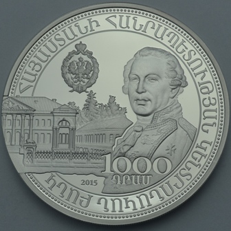 Հուշադրամի դիմերեսին պատկերված է Հայաստանի Հանրապետության զինանշանը: Մակագրություններն են` «Հայաստանի Հանրապետություն», «Republic of Armenia», «1000 դրամ», «2015»: