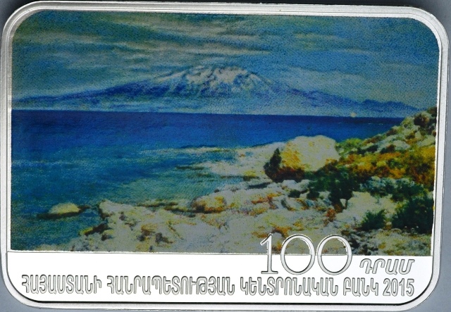 Հուշադրամի դիմերեսին պատկերված է Փ. Թերլեմեզյանի «Վանա լիճը և Սիփան սարը Կտուց կղզուց» կտավից դրվագ, ներքևում՝ «100 դրամ», «Հայաստանի Հանրապետության կենտրոնական բանկ 2015» մակագրություններն են: