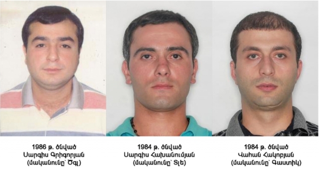 ՀՀ ոստիկանությունից հայտնում են, որ այսօր՝ մարտի 23-ին, ժամը 21-ի սահմաններում, ինքնակամ ոստիկանության կազմակերպված հանցավորության դեմ պայքարի գլխավոր վարչություն են ներկայացել 2015 թ. մարտի 4-ին «Նուբարաշեն» ՔԿՀ-ի մոտ կատարված առանձնապես ծանր հանցագործության համար ՀՀ քրեական օրենսգրքի 104 և 235 հոդվածների հատկանիշներով մեղադրվող՝ 1986 թ. ծնված Սարգիս Գրիգորյանը (մականունը՝ Ծգլ), 1984 թ. ծնված Սարգիս Հախանումյանը (մականունը՝ Տլե) և 1984 թ. ծնված Վահան Հակոբյանը (մականունը՝ Գաստիկ): ՀՀ Ազգային անվտանգության ծառայության և ոստիկանության համատեղ միջոցառումները շարունակվում են: