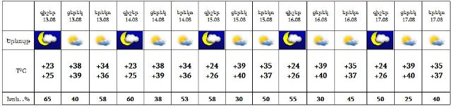 Օգոստոսի 13-17-ին հանրապետությունում սպասվում է առանց տեղումների եղանակ: Քամին՝ հարավային 2-5 մ/վրկ: Օդի ջերմաստիճանն 13-ին կբարձրանա 1-2 աստիճանով, 15-ին ևս 1-2 աստիճանով: