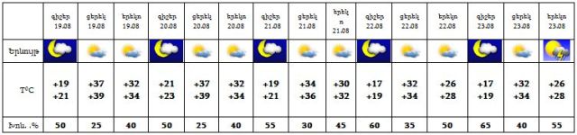 Օգոստոսի 19-ին սպասվում է առանց տեղումների եղանակ, 21-22-ի երեկոյան ժամերին հնարավոր է ամպրոպ, անձրևի հավանականությունը փոքր է, 23-ի երեկոյան ժամերին սպասվում է կարճատև անձրև և ամպրոպ: Ամպրոպի ժամանակ հնարավոր է քամու ուժգնացում` 15-20 մ/վրկ արագությամբ: