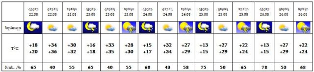 Օգոստոսի 22-ի երեկոյան ժամերին հնարավոր է ամպրոպ, անձրևի հավանականությունը փոքր է, 23-26-ի երեկոյան ժամերին և գիշերվա առաջին կեսին սպասվում է կարճատև անձրև և ամպրոպ: Ամպրոպի ժամանակ հնարավոր է քամու ուժգնացում` 15-20 մ/վրկ արագությամբ: