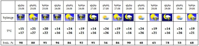Օգոստոսի 25-26-ին ժամանակ առ ժամանակ, 27-29-ին առավելապես երեկոյան ժամերին և գիշերվա առաջին կեսին սպասվում է անձրև և ամպրոպ: Ամպրոպի ժամանակ հնարավոր է քամու ուժգնացում` 15-20 մ/վրկ արագությամբ: