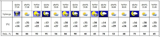 Օգոստոսի 27-29-ին սպասվում է անձրև և ամպրոպ: Ամպրոպի ժամանակ հնարավոր է քամու ուժգնացում` 15-20 մ/վրկ արագությամբ: