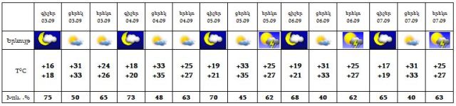 Սեպտեմբերի 3-4-ին սպասվում է առանց տեղումների եղանակ, 5-7-ի գիշերը և երեկոյան ժամերին սպասվում է կարճատև անձրև և ամպրոպ: