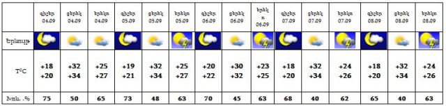 Սեպտեմբերի 4-ին սպասվում է առանց տեղումների եղանակ, 5-8-ի գիշերը և երեկոյան ժամերին սպասվում է կարճատև անձրև և ամպրոպ: