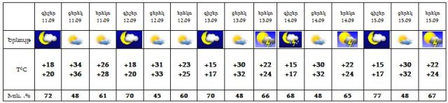 Սեպտեմբերի 11-ին սպասվում է առանց տեղումների եղանակ, 12-15-ին առավելապես հյուսիսային շրջաններում երեկոյան ժամերին և գիշերը սպասվում է կարճատև անձրև և ամպրոպ:
