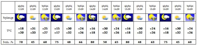Սեպտեմբերի 12-16-ին առավելապես հյուսիսային շրջաններում երեկոյան ժամերին և գիշերը սպասվում է կարճատև անձրև և ամպրոպ: